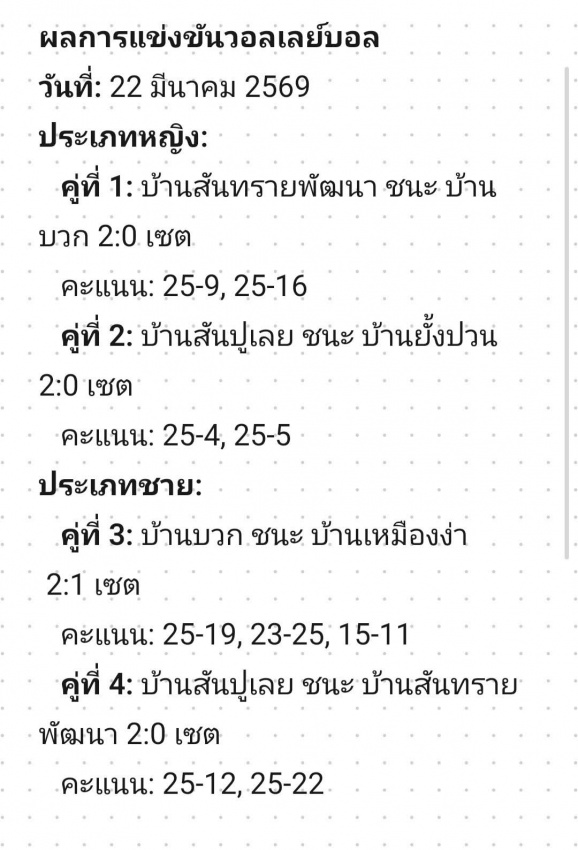 ผลการแข่งขันวอลเลย์บอล วันที่ 22 มีนาคม 2569