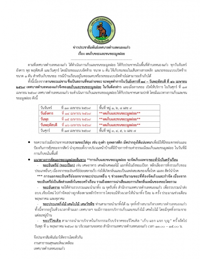 เทศบาลตำบลหนองแก๋ว งดเก็บขยะวันอังคารที่ 14 ? วันพฤหัสบดี ที่ 16 เมษายน 2569 เนื่องจากลานขยะแม่ขาน ซึ่งเป็นสถานที่ขนถ่ายขยะ หยุดทำการ