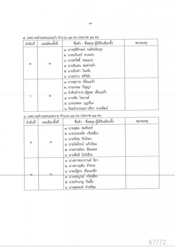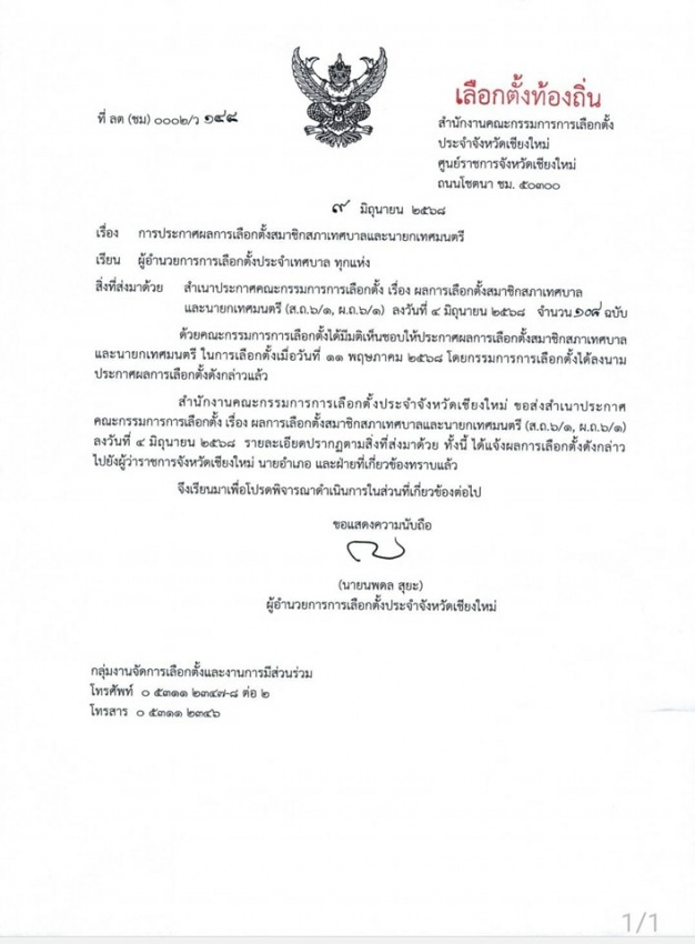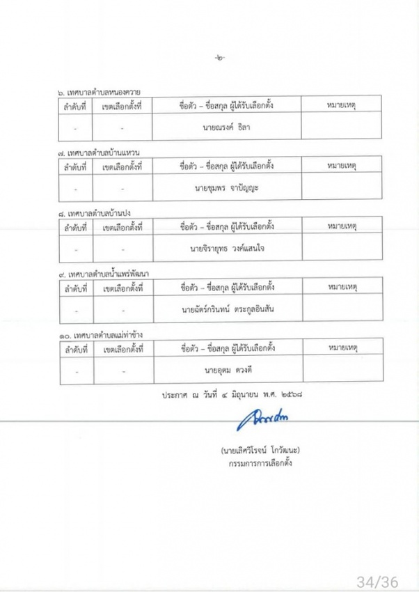 กกต.ประกาศผลการเลือกตั้ง นายกเทศมนตรีตำบลหนองแก๋ว และสมาชิกสภาเทศบาลตำบลหนองแก๋ว ทั้ง 2 เขตเลือกตั้ง ตั้งแต่วันที่ 4 มิถุนายน 2568