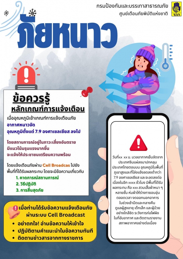 ระบบ Cell Broadcast เป็นช่องทางหนึ่งที่ภาครัฐใช้ในการแจ้งเตือนประชาชนให้ทราบสถานการณ์ภัยต่าง ๆ ล่วงหน้า เพื่อให้สามารถเตรียมความพร้อมและปฏิบัติตามคำแนะนำได้อย่างทันท่วงที โดยจะมีข้อความแจ้งเตือนส่งถึงโทรศัพท์มือถือของประชาชนที่อยู่ในพื้นที่เสี่ยงภัย ครอบคลุมภัยพิบัติหลายประเภท ได้แก่