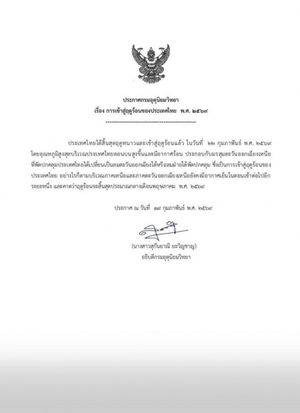 กรมอุตุฯ ประกาศไทยเข้าฤดูร้อน 22 ก.พ. เตือนพายุช่วงแรก ร้อนสูงสุด 43 องศาฯ 19 กุมภาพันธ์ 2569 ? กรมอุตุนิยมวิทยาประกาศประเทศไทยจะเข้าสู่ฤดูร้อนอย่างเป็นทางการตั้งแต่วันที่ 22 กุมภาพันธ์ 2569 เป็นต้นไป พร้อมเตือน ช่วงเปลี่ยนฤดูระหว่างวันที่ 23?25 กุมภาพันธ์ จะเกิดพายุฤดูร้อนในประเทศไทยตอนบน ขณะเดียวกันปีนี้มีแนวโน้มร้อนกว่าปีก่อน และอุณหภูมิสูงสุดอาจแตะ 42?43 องศาเซลเซียส