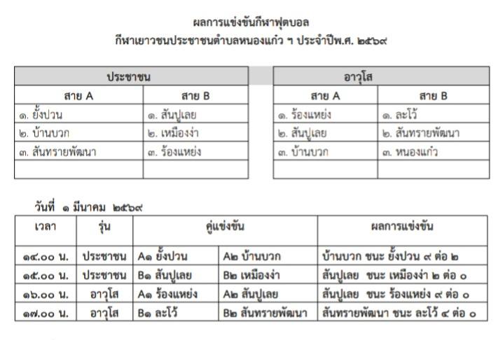 ผลการแข่งขันฟุตบอลโครงการแข่งขันกีฬาเยาวชนประชาชนตำบลหนองแก๋ว ต้านยาเสพติด และสร้างเสริมความปรองดองสมานฉันท์ ประจำปีงบประมาณ พ.ศ. ๒๕๖๙ วันที่ 1 มีนาคม 2569