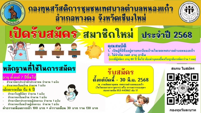 กองทุนสวัสดิการชุมชนเทศบาลตำบลหนองแก๋ว รับสมัครสมาชิกกองทุนฯ ตั้งแต่บัดนี้ จนถึง 30 มิถุนายน 2568