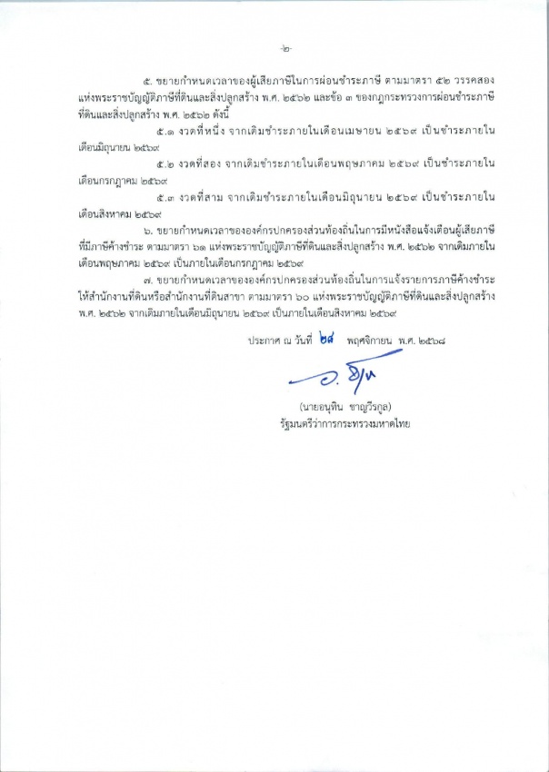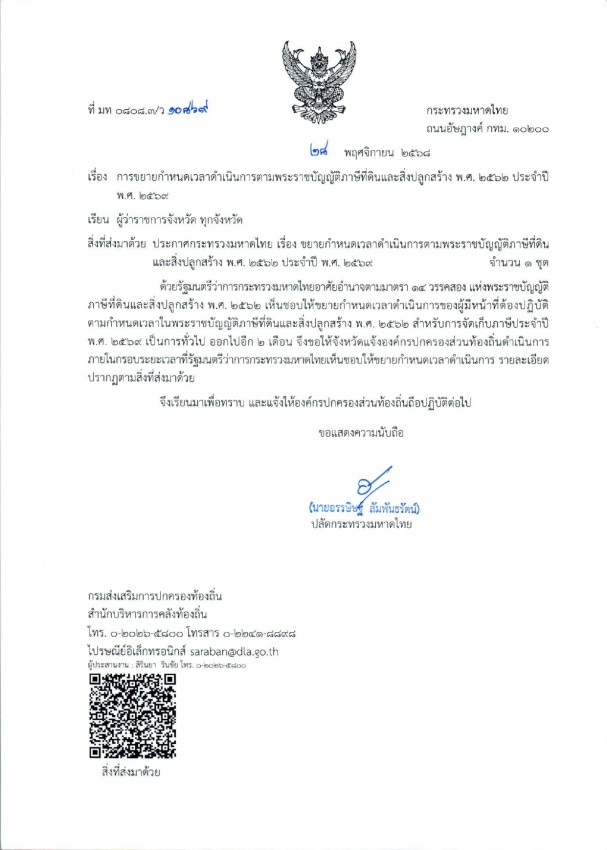 ประกาศ ขยายระยะเวลาดำเนินการจัดเก็บภาษีที่ดินและสิ่งปลูกสร้าง ประจำปี 2569